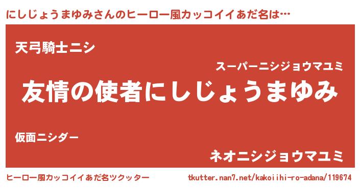 | 男性向けラノベタイトル風あだ名 | 『おまえをオタクにしてやるから、俺をにしじょうまゆみにしてくれ! 』 |