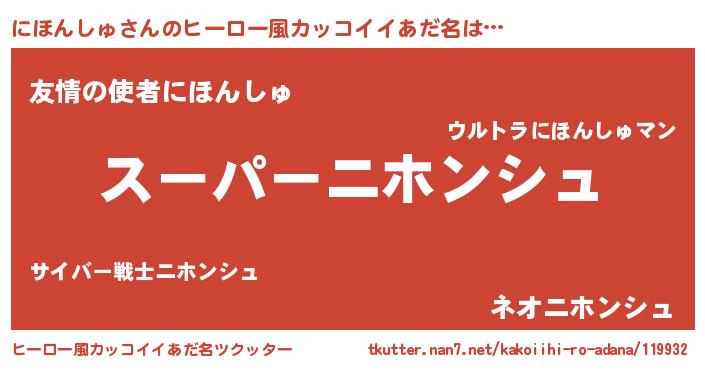 | 男性向けラノベタイトル風あだ名 | 『にほんしゅ~年齢イコール彼女いない歴の魔法使い~』 |
