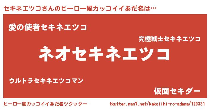| 胡散臭い通販商品みたいなあだ名 | 『絶対に幸福をもたらす水素水…その名も「セキネエツコ」』 |