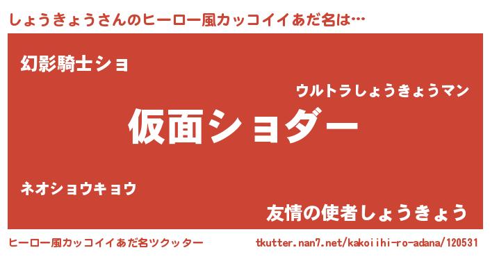 | 男性向けラノベタイトル風あだ名 | 『この素晴らしい世界にしょうきょうを!』 |