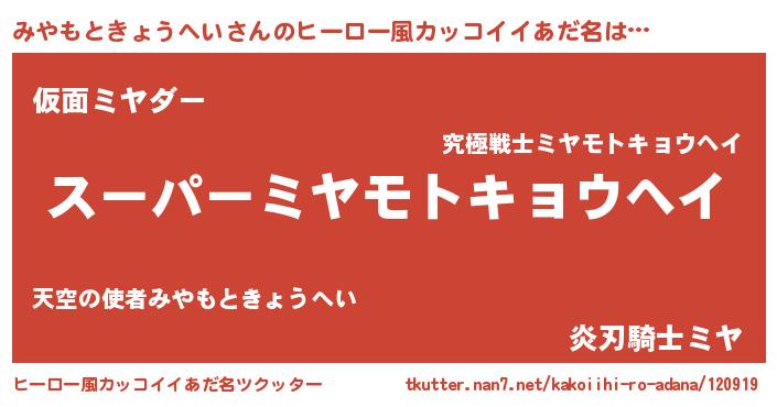 | 胡散臭い通販商品みたいなあだ名 | 『億万長者になれるブレスレット…その名も「みやもときょうへい」』 |