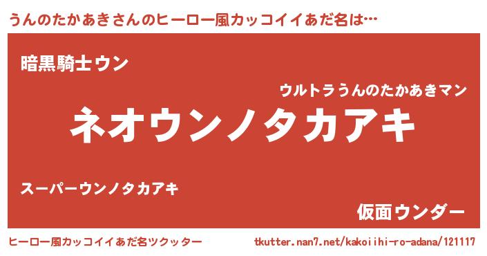 | 男性向けラノベタイトル風あだ名 | 『うんのたかあきという概念が存在しない退屈な世界 』 |
