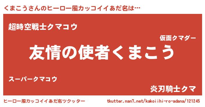| 男性向けラノベタイトル風あだ名 | 『おまえをオタクにしてやるから、俺をくまこうにしてくれ! 』 |