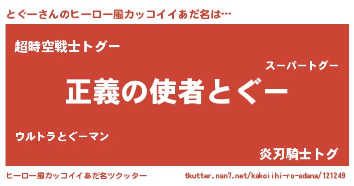 | 男性向けラノベタイトル風あだ名 | 『トグースレイヤー』『とぐーの憂鬱』 |