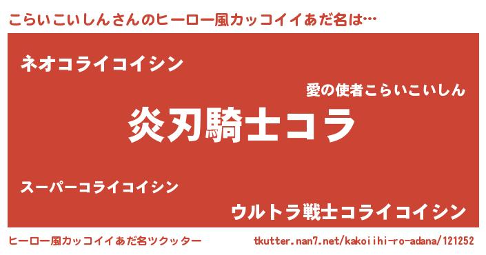 | 男性向けラノベタイトル風あだ名 | 『こらいこいしんの嫁は女の子じゃないと思った?』 |