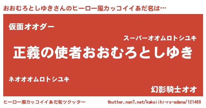 | 男性向けラノベタイトル風あだ名 | 『おまえをオタクにしてやるから、俺をおおむろとしゆきにしてくれ! 』 |