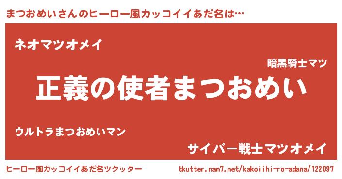 | 男性向けラノベタイトル風あだ名 | 『おまえをオタクにしてやるから、俺をまつおめいにしてくれ! 』 |