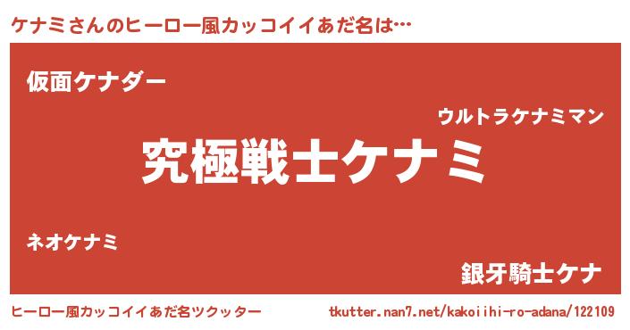 | 男性向けラノベタイトル風あだ名 | 『Re:ケナミから始める異世界生活』 |