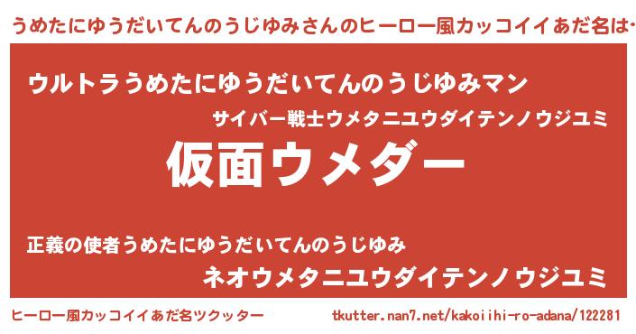 | 意味不明あだ名 | 『住所不定無職うめたにゆうだいてんのうじゆみ(12歳)』 |