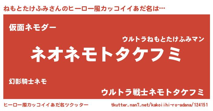 | 女子向けラノベタイトル風あだ名 | 『異世界で失敗しない100のねもとたけふみ』 |