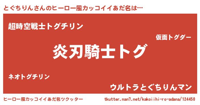 | 男性向けラノベタイトル風あだ名 | 『とぐちりんの嫁は女の子じゃないと思った?』 |