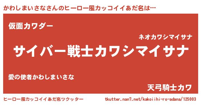 | 男性向けラノベタイトル風あだ名 | 『Re:かわしまいさなから始める異世界生活』 |