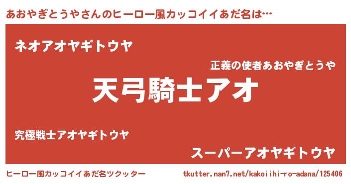 | 男性向けラノベタイトル風あだ名 | 『あおやぎとうやの嫁は女の子じゃないと思った?』 |