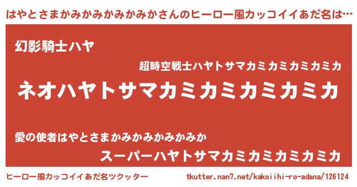 | 男性向けラノベタイトル風あだ名 | 『うちのはやとさまかみかみかみかみかが世界を掌握している!』 |