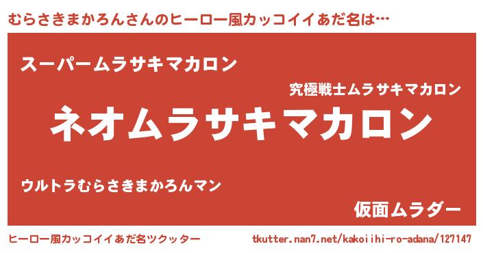 | 男性向けラノベタイトル風あだ名 | 『むらさきまかろん~年齢イコール彼女いない歴の魔法使い~』 |