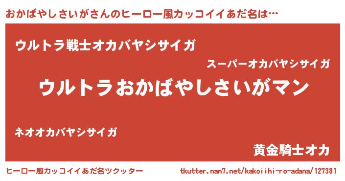 | 男性向けラノベタイトル風あだ名 | 『うちの娘の為ならば、俺はもしかしたらおかばやしさいがも倒せるかもしれない。』 |