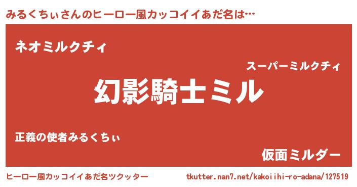 | 男性向けラノベタイトル風あだ名 | 『うちのみるくちぃが世界を掌握している!』 |