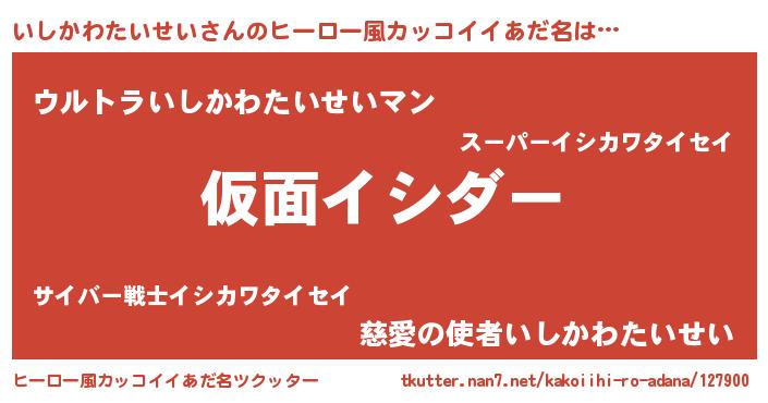 | 女子向けラノベタイトル風あだ名 | 『いしかわたいせいが死なない童話 林檎のいしかわたいせいの診療簿』 |