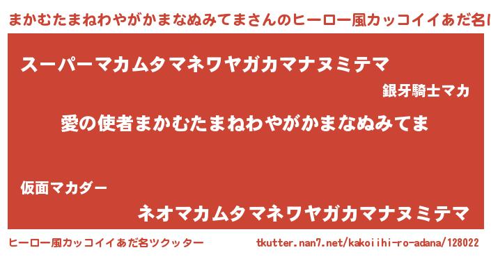 | 男性向けラノベタイトル風あだ名 | 『おまえをオタクにしてやるから、俺をまかむたまねわやがかまなぬみてまにしてくれ! 』 |