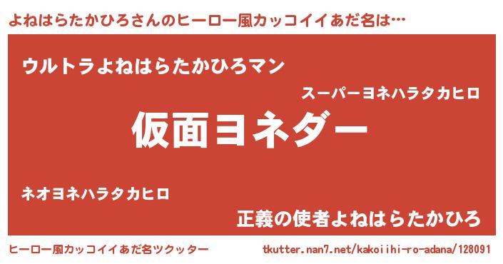 | 男性向けラノベタイトル風あだ名 | 『この素晴らしい世界によねはらたかひろを!』 |