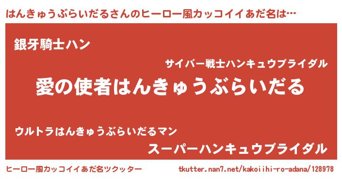 | 女子向けラノベタイトル風あだ名 | 『はんきゅうぶらいだる恋絵巻』 |