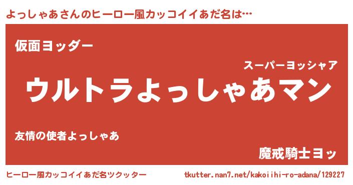 | 男性向けラノベタイトル風あだ名 | 『うちの娘の為ならば、俺はもしかしたらよっしゃあも倒せるかもしれない。』 |