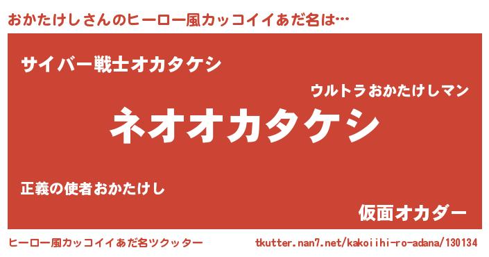 | 男性向けラノベタイトル風あだ名 | 『おかたけし~年齢イコール彼女いない歴の魔法使い~』 |