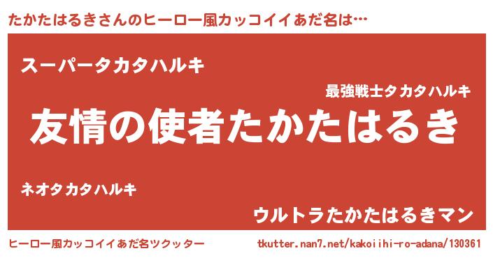 | 男性向けラノベタイトル風あだ名 | 『おまえをオタクにしてやるから、俺をたかたはるきにしてくれ! 』 |