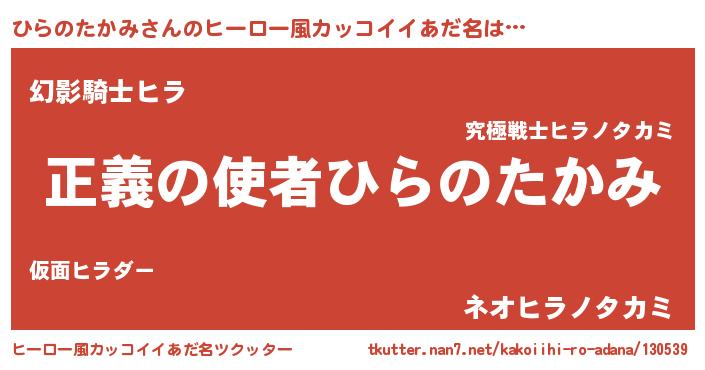 | 男性向けラノベタイトル風あだ名 | 『おまえをオタクにしてやるから、俺をひらのたかみにしてくれ! 』 |