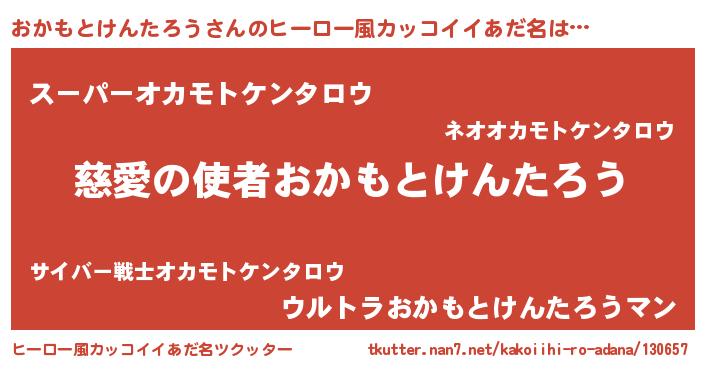 | 男性向けラノベタイトル風あだ名 | 『おかもとけんたろう~年齢イコール彼女いない歴の魔法使い~』 |