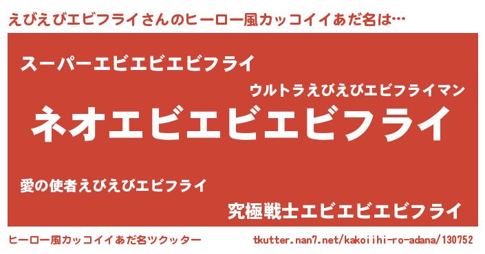 | 男性向けラノベタイトル風あだ名 | 『えびえびエビフライという概念が存在しない退屈な世界 』 |