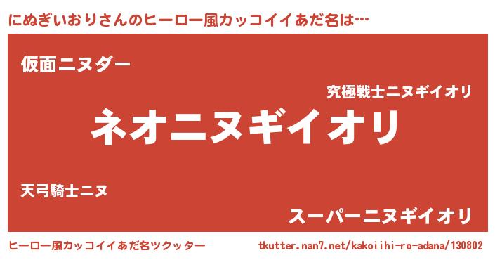 | 女子向けラノベタイトル風あだ名 | 『異世界で失敗しない100のにぬぎいおり』 |
