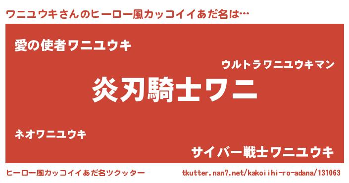 | 男性向けラノベタイトル風あだ名 | 『ワニユウキ~年齢イコール彼女いない歴の魔法使い~』 |