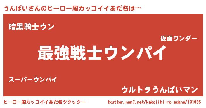 | 男性向けラノベタイトル風あだ名 | 『Re:うんぱいから始める異世界生活』 |