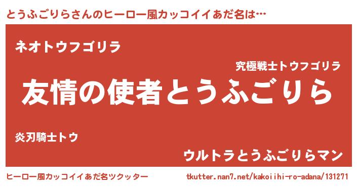 | 男性向けラノベタイトル風あだ名 | 『おまえをオタクにしてやるから、俺をとうふごりらにしてくれ! 』 |