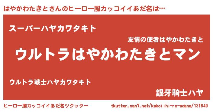 | 男性向けラノベタイトル風あだ名 | 『はやかわたきとに滅ぼされるだけの簡単なお仕事です』 |