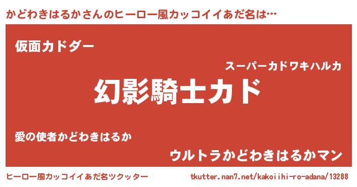 | 男性向けラノベタイトル風あだ名 | 『かどわきはるかの嫁は女の子じゃないと思った?』 |