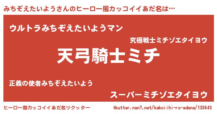 | 男性向けラノベタイトル風あだ名 | 『みちぞえたいようの嫁は女の子じゃないと思った?』 |