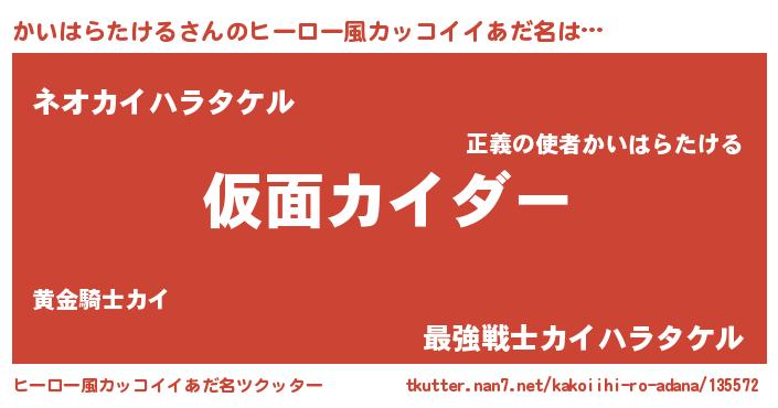 | 男性向けラノベタイトル風あだ名 | 『カイハラタケルスレイヤー』 |