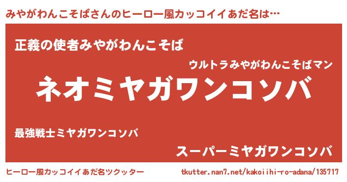 | 男性向けラノベタイトル風あだ名 | 『はたらくみやがわんこそばさま!』 |