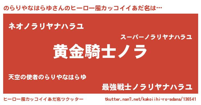 | ポケモン風あだ名 | 『ヒノラリヤナハラユ』『ゼニノラ』 |