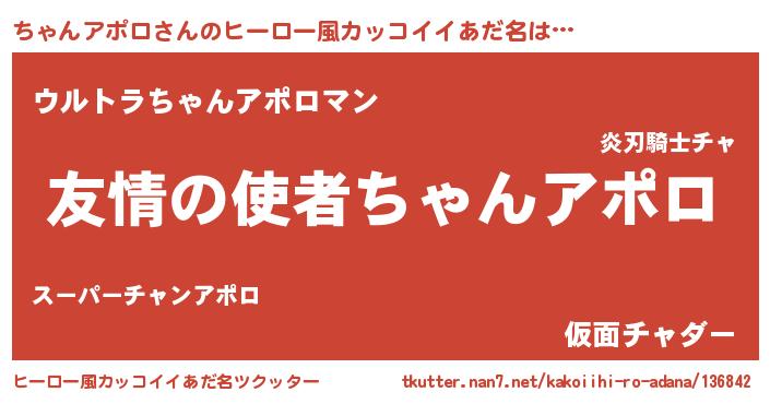 | 男性向けラノベタイトル風あだ名 | 『おまえをオタクにしてやるから、俺をちゃんアポロにしてくれ! 』 |