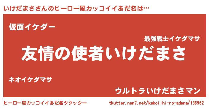 | 男性向けラノベタイトル風あだ名 | 『おまえをオタクにしてやるから、俺をいけだまさにしてくれ! 』 |