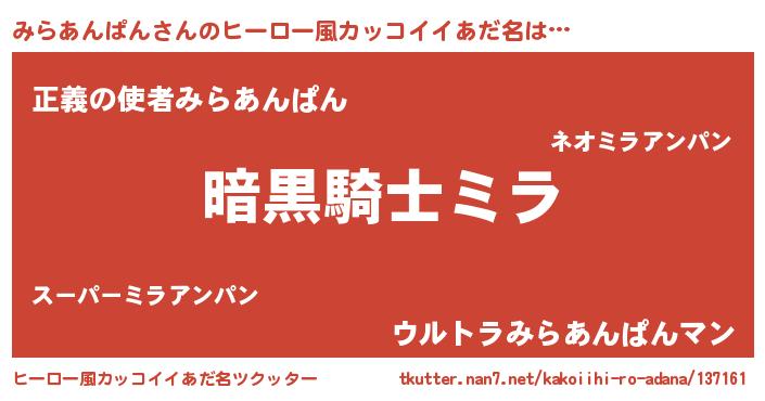 | 女子向けラノベタイトル風あだ名 | 『みらあんぱんは平凡を望む』 |