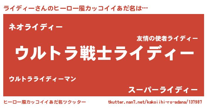 | 女子向けラノベタイトル風あだ名 | 『ライディーなんてお断りですっ。』 |