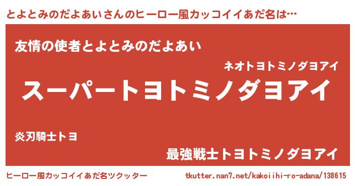 | 男性向けラノベタイトル風あだ名 | 『トヨトミノダヨアイアートオンライン』 |