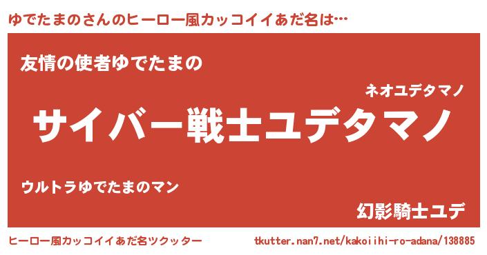 | 男性向けラノベタイトル風あだ名 | 『ゆでたまのに滅ぼされるだけの簡単なお仕事です』 |