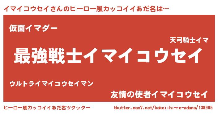 | 男性向けラノベタイトル風あだ名 | 『イマイコウセイに滅ぼされるだけの簡単なお仕事です』 |