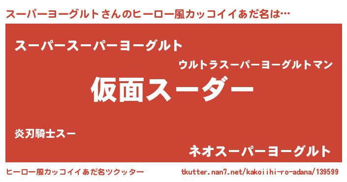 | 男性向けラノベタイトル風あだ名 | 『スーパーヨーグルト~年齢イコール彼女いない歴の魔法使い~』 |