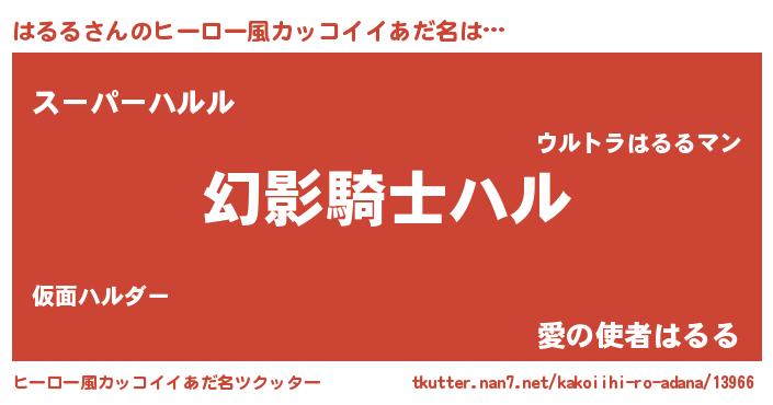 | 男性向けラノベタイトル風あだ名 | 『はるるの嫁は女の子じゃないと思った?』 |